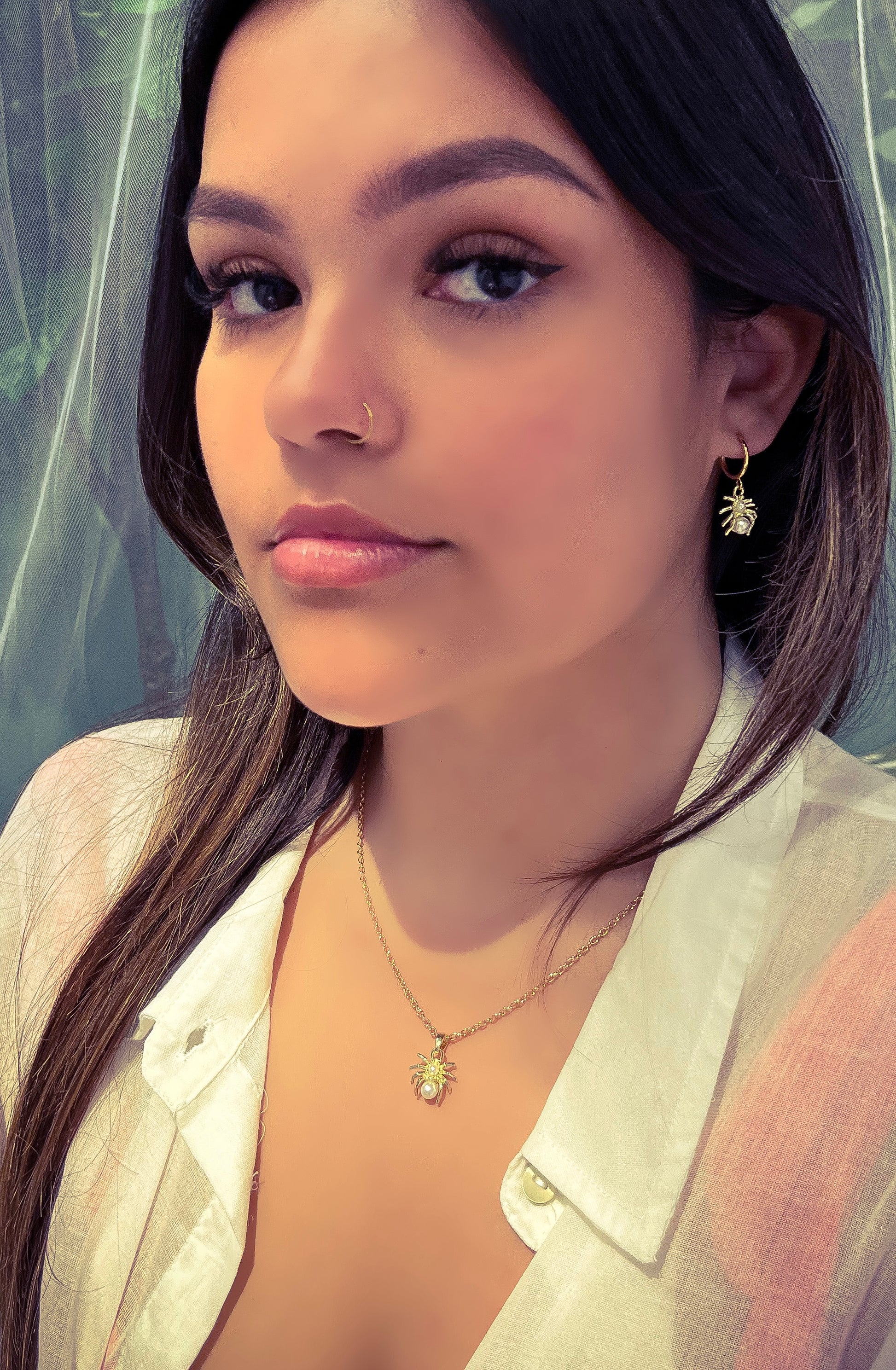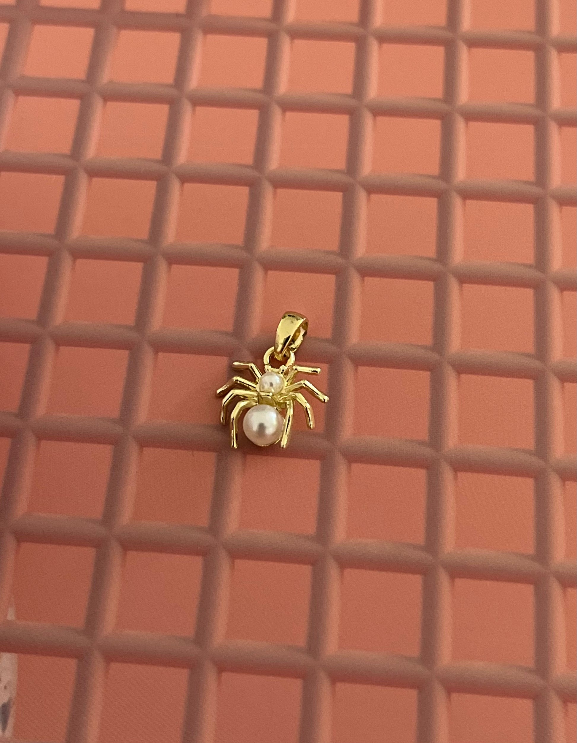 A 14k golden pendant in the shape of a spider with a freshwater pearl